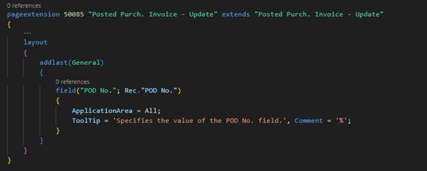 3) Now we come on development so here we extend Purchase Invoice Header table, Posted Purchase Invoice page and Posted Purch. Inv. – Update page to add new field POD No.