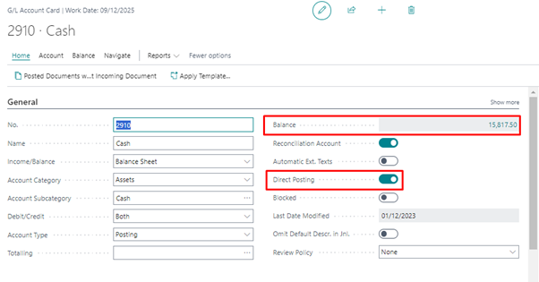 Enable the “Reconciliation Account” Boolean in the G/L Account card and have a look on current balance on this Cash Account.